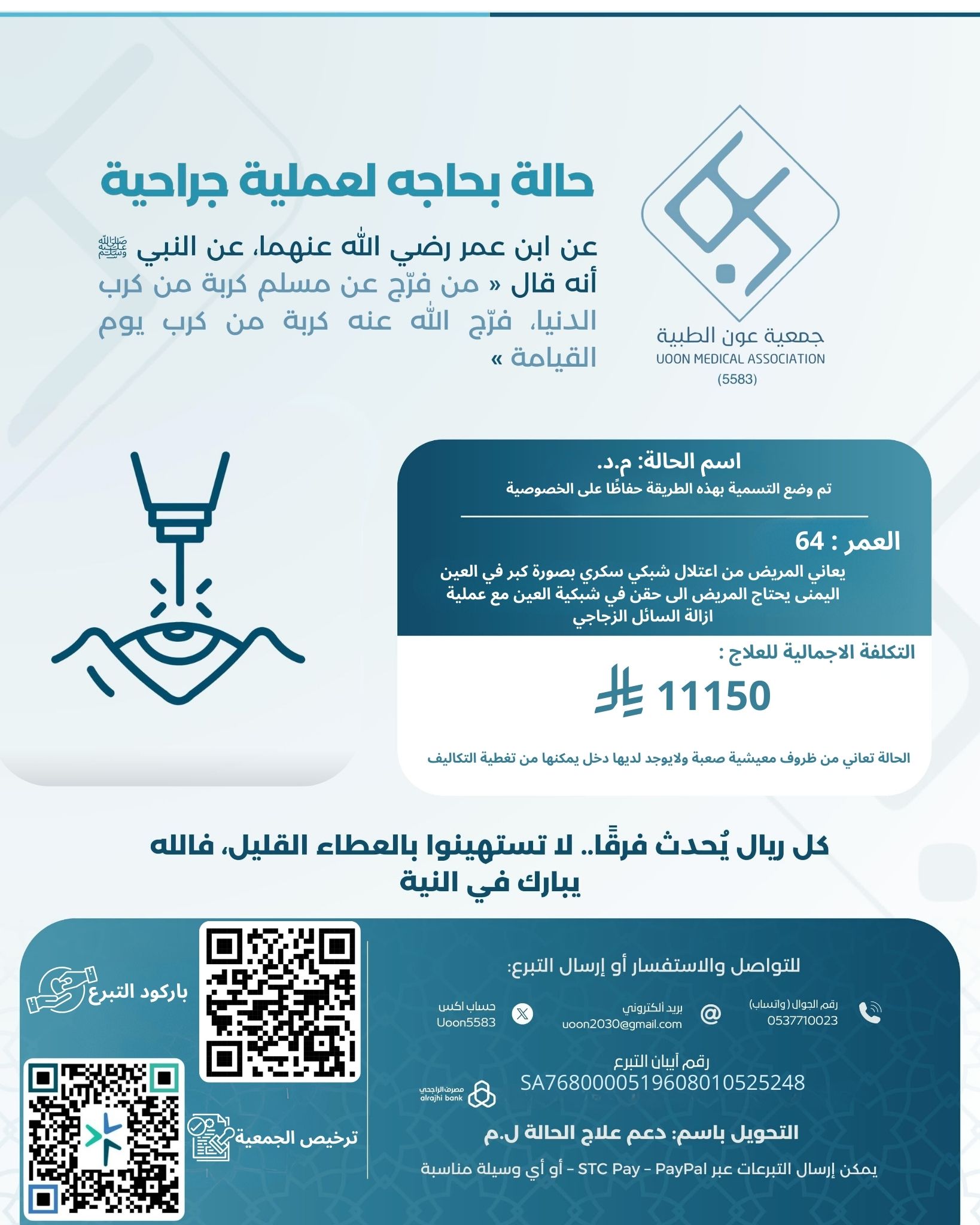 ظروفه المعيشية الصعبة وضيق الحال تمنعه من تغطية تكاليف العلاج والعملية، مما يجعله في خطر حقيقي لفقدان النور من عينيه. مساهمتكم الكريمة ستكون طوق النجاة له بعد الله، وفرصة حقيقية لإنقاذ بصره ومنحه أملًا جديدًا في رؤية الحياة من حوله